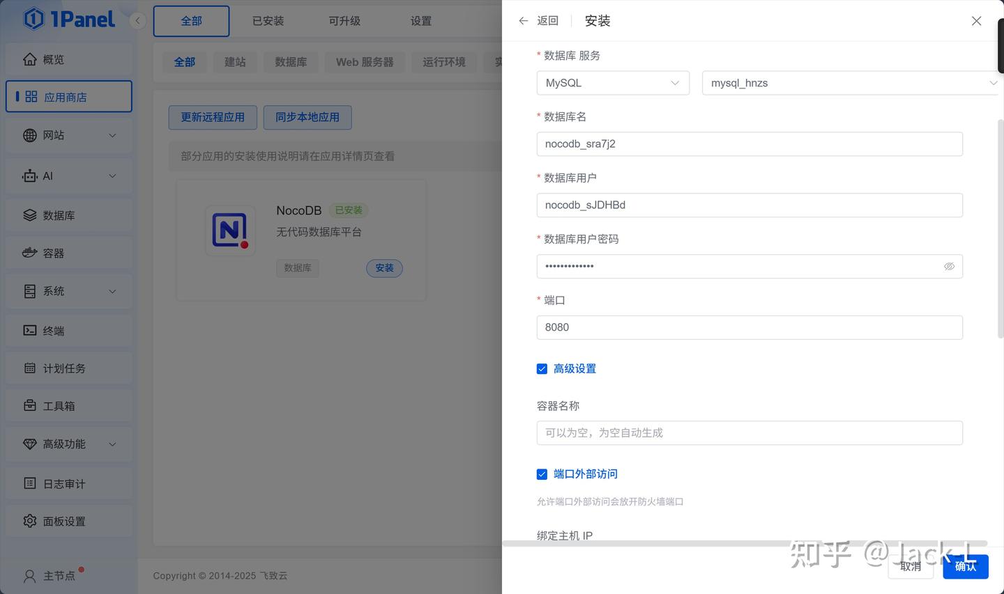 回到应用商店,点击安装Nocodb,视情况勾选端口外部访问,如果不勾选,需要配置代理转发才能让SAP访问到Nocodb的服务。