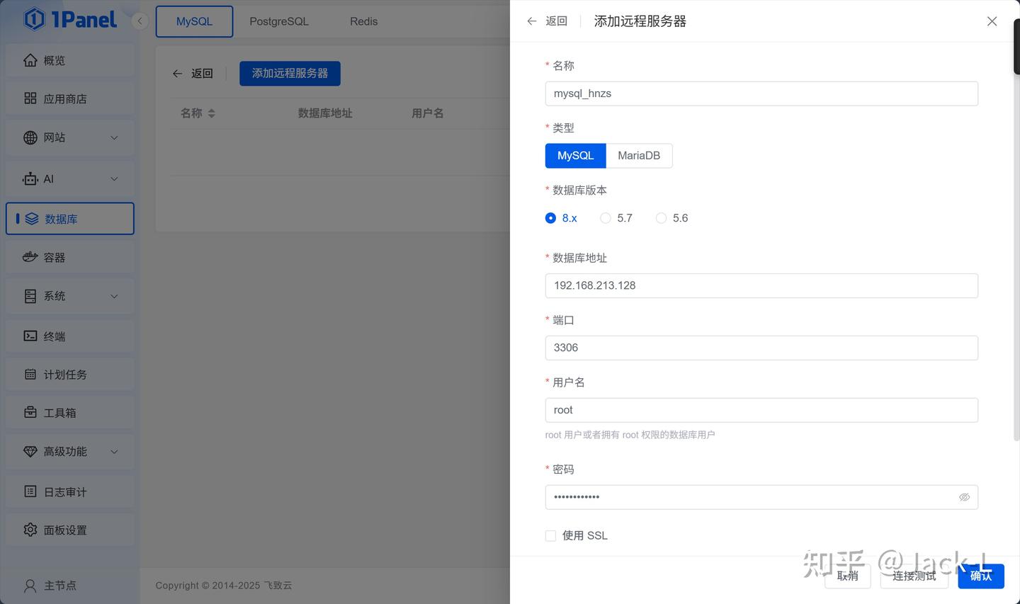 安装时需要选择数据库,所以我们要在下方数据库菜单中提前配置,如果你的1Panel和MySQL在同一太机器上,应该可以省略一步。