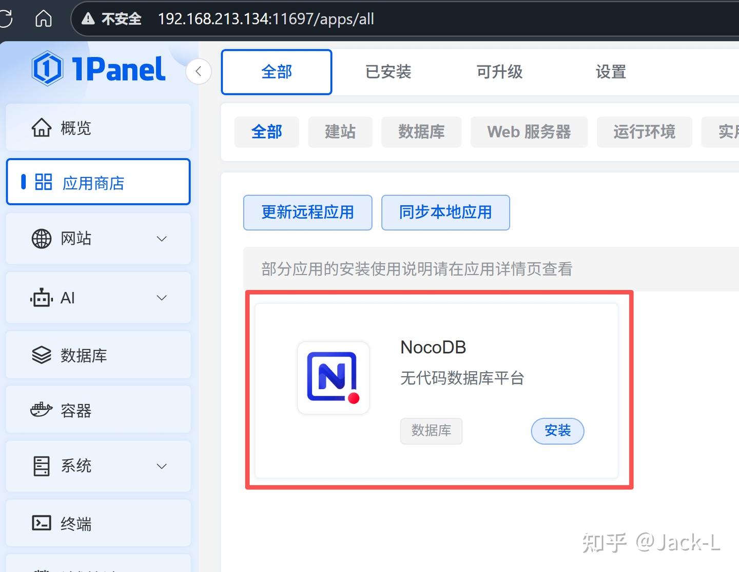 进入管理面板之后,在应用商店我们就可以直接搜索并安装Nocodb了。