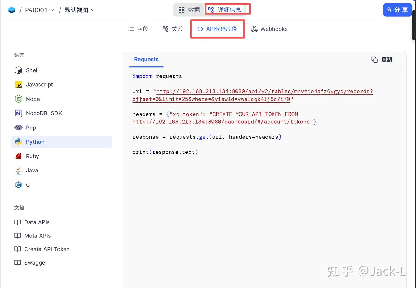 在详细信息里,我们就能看到,Nocodb已经自动为这张表创建了一个API,并给出了一些常见语言的调用示例。